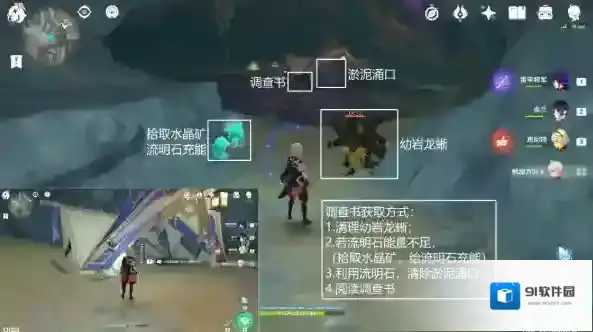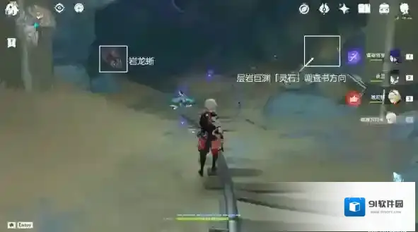 往地图的西南方向走,进入底部矿洞,当看到图中岩龙蜥后,前往图中层岩巨渊「灵石」调查书方向