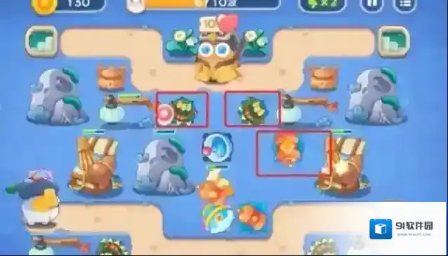 1、第一波先把左侧下方的多重箭升一级,再加一泡泡塔。
