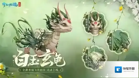 全新坐骑白玉玄龟也与春日时装同步上新!温润细腻的白玉龟壳如一轮明月,周身君子兰叶片优雅挺拔,额间的朱色玛瑙自带百年神龟的威严,寓意着吉祥长寿。胸前的发光明珠与点缀的黄白小花相互映衬,绿色纱绸营造出浓浓的春日气息。骑上白玉玄龟漫步山野间,行走时脚下生风,仿佛拥有了一座春日移动花园!