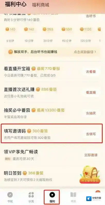 1、打开番茄小说“福利中心”,下滑界面找到“填写邀请码”,点击后面的“去填写”