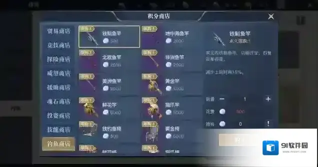 2、建议优先购买铁制鱼竿、鱼椅过渡,然后慢慢积累购买5000鱼币的最终鱼竿。