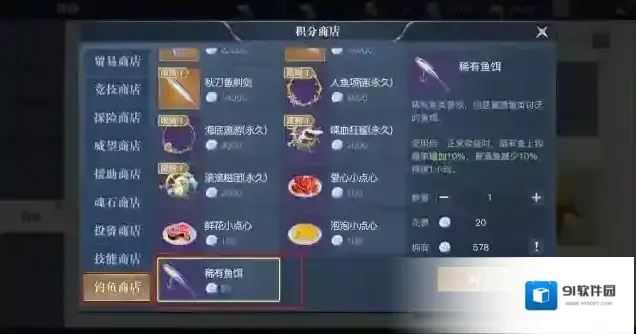 积分商城可以消耗鱼币购买渔具、衣服、武器外观等物品,以及了解渔具所需鱼币及渔具功能。