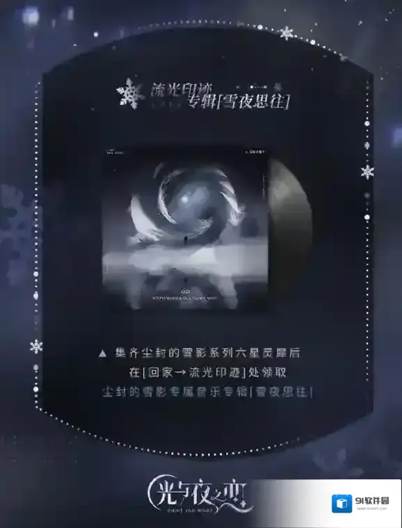 集齐尘封的雪影系列限定六星灵犀,可在回家 – 流光印迹处领取留声机纪念专辑雪夜思往。
