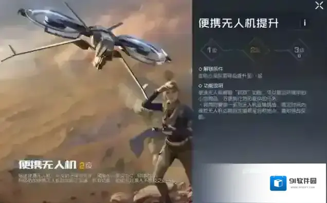 获取后,可解锁部分空战挑战。便携无人机可从随身工具处进入便携无人机操作模式,特有的扫射与导弹的攻击方式可供作战。