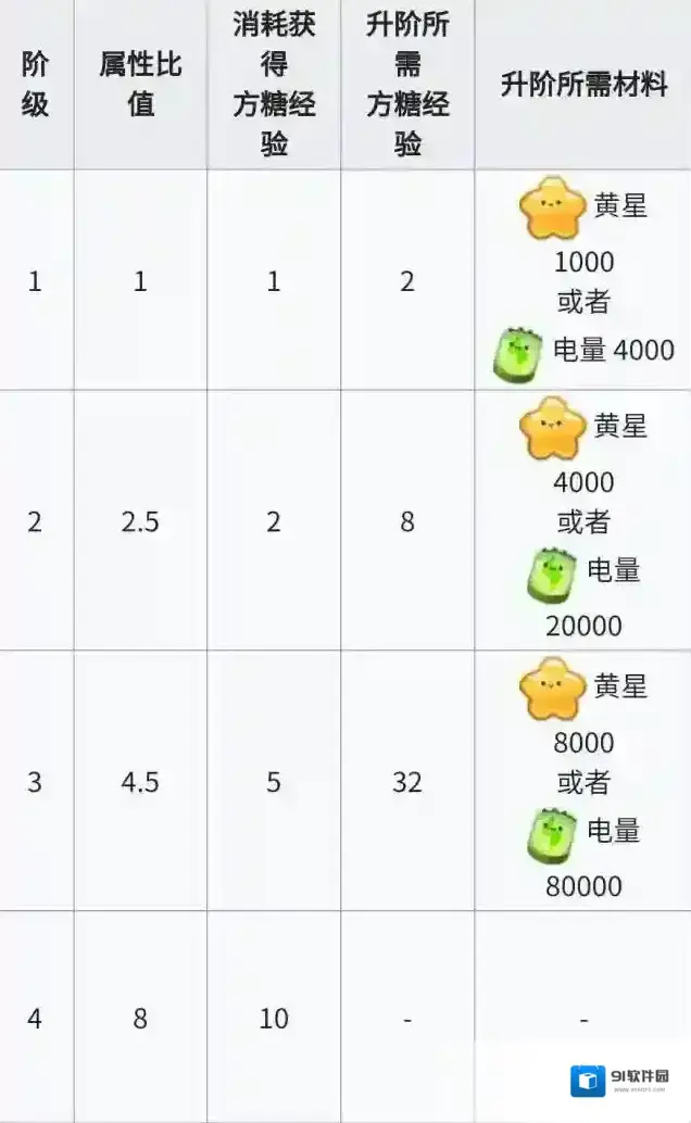 上图截自《弹力果冻wiki》,然后属性比值那些不用管,一个方糖经验指的是一个一阶方糖,一阶升二阶要消耗两颗一阶方糖,二阶升三阶要消耗八颗一阶方糖…以此类推。升阶方糖最好是使用一阶方糖,用其他高阶方糖多多少少都会亏点。