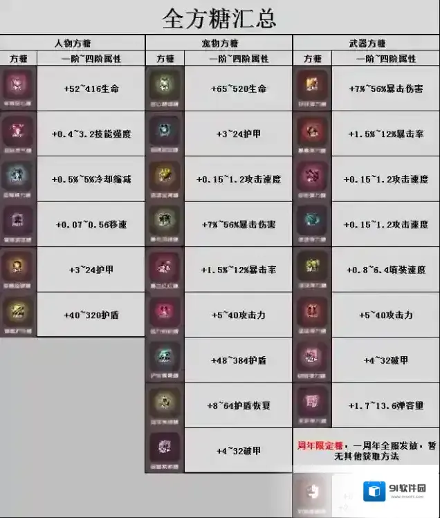 首先介绍一下所有的方糖类型(人物,武器,宠物三个的方糖都是各自独立互相不干涉的)