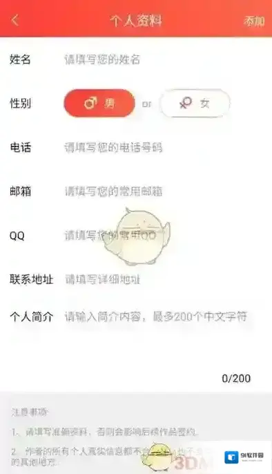 4、然后进入个人资料填写界面,在这里输入自己的姓名、性别、电话等信息,填写完成后点击右上角的添加选项即可成为作者;