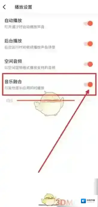 4、找到“音乐融合”选项,打开开关,并调整音量,设置完成。