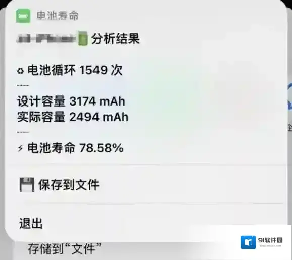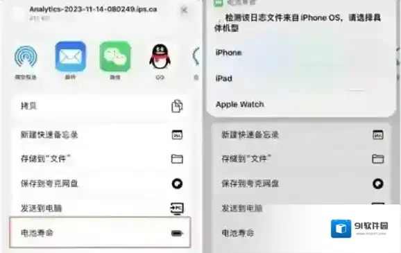6、点击右上角的分享按钮,从分享选项中选择「电池寿命」,按提示选择你的iPhone型号。
