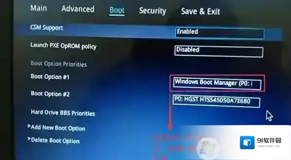 3、继续把boot option#1选项改为普通引导的,boot option#1和boot option#2硬盘启动位置对换,设置第一启动项为普通硬盘引导,带Windwos Boot Manager的为UEFI引导分区;