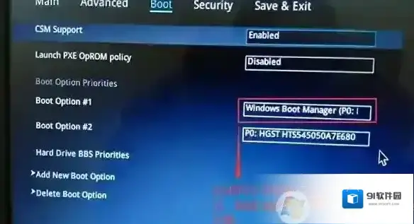 3、继续把boot option#1选项改为普通引导的,boot option#1和boot option#2硬盘启动位置对换,设置第一启动项为普通硬盘引导,带Windwos Boot Manager的为UEFI引导分区,如图: