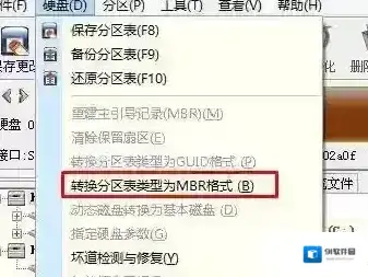 2、删除分区后,装换硬盘分区表类型 为 MBR 格式,同样还是从“硬盘”–“转换分区表类型为MBR格式”,然后保存更改(以下为图示,此时该项为可点,如不可点说明已经转换好了。)