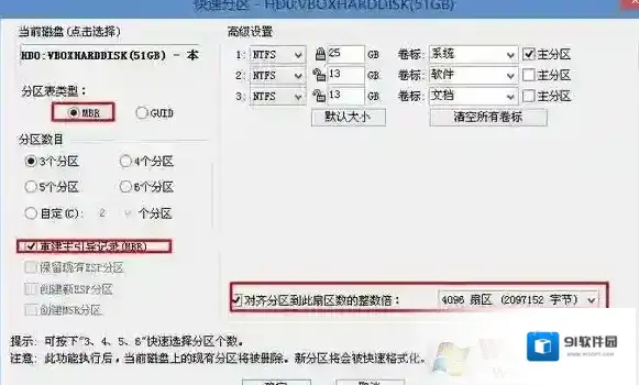 3、转换完成后,执行快速分区,分区大小几磁盘个数自己选择,确保分区表类型为MbR ,及勾选了重建主引导记录MBR,按下确定后开始分区(对了,如果是固态硬盘可要4K对齐一下哦);