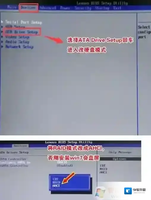 4、切将键盘移动Devices选项,把键盘移动ATA Drive Setup回车,将configure SATA as中默认的raid改成ahci模式,否则安装win7时会出现0x0000007b蓝屏,因为win7中没有集成raid硬盘驱动,然后选择F10保存设置,在弹出的选项中选择YES,如下图所示;