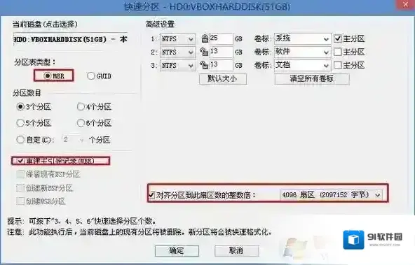 重新分区:磁盘格式转换完成后,点击快速分区,勾选 分区表类型为 MbR ,勾选了重建主引导记录MBR,选择需要分区的个数以及大小,当然大家可以点击“自定”来设置合适的分区,按下确定后开始分区(如果是固态硬盘或者是东芝的硬盘要进行4K对齐一下),如下图: