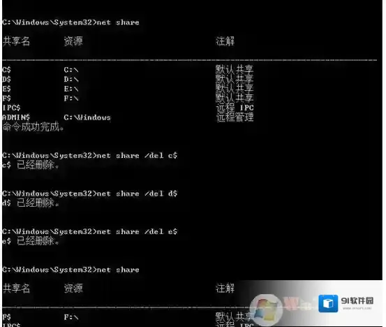 2、现在,我们执行net share查看共享,然后使用net share 名称 /del,可进行关闭;