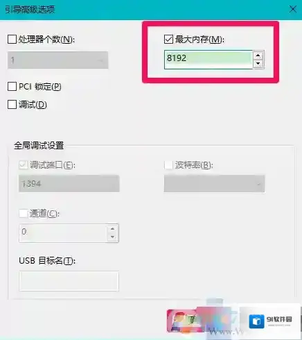 7、我们点击最大内存(M)前面的复选框打勾,将数值更改为:8192(MB,即电脑配置的内存值),再点击:确定;