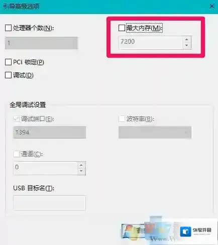 6、在打开的引导高级选项窗口,可以看到最大内存(M)的值为7200;