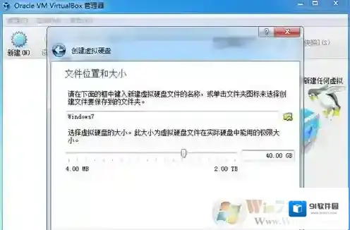 6、虚拟硬盘大小自行设置,比如40GB,鼠标左键点击创建;