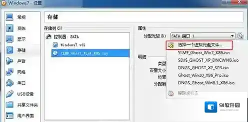 8、点击存储-“没有盘片”-右侧光盘图标-选择一个虚拟光盘文件,选择win7 iso镜像文件;
