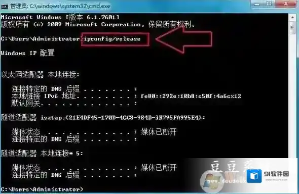 2、打开命令提示符窗口后并输入“ipconfig/release”命令按回车键(如下图所示),等待命令执行完成后重启电脑即可修复当前网络问题。