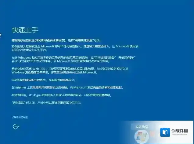 11、看到下面这个界面,Win10升级完成了,接下来就是Win10初始化的系统设置界面,如果你喜欢自己设置,可以逐条看看。这里点击自定义设置或使用快速设置,小编喜欢简单选择了快速设置。