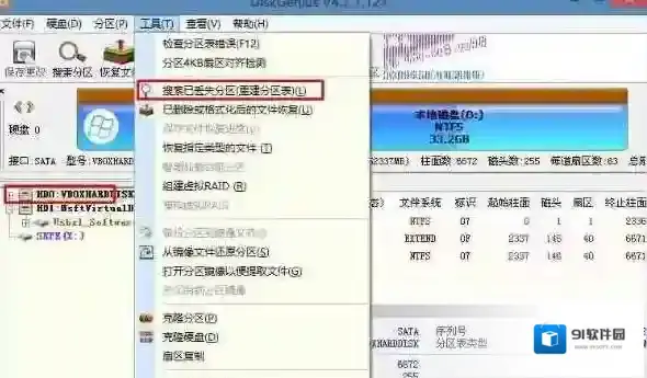 2、打开diskgenius工具后,选中硬盘,然后点击上面的“工具”–搜索已丢失的分区(重建分区表);