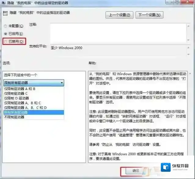 2、在“组策略编辑器”窗口中依次展开“用户配置”→“管理模板”→“Windows组件”目录,并选中“Windows资源管理器”选项。双击打开“隐藏‘我的电脑’中的这些指定的驱动器”选项,然后设置成 已禁用 确定即可。