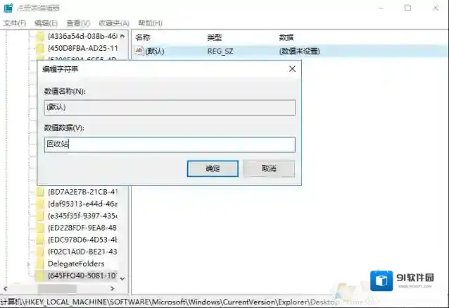 5、打开刚刚新建的项,点击右侧的“默认”,将其数值数据改为“回收站”。然后重启电脑即可。