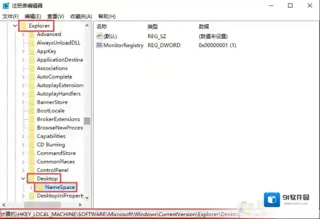 3、在注册表编辑器中,依次展开“HKEY_LOCAL_MACHINE→SOFTWARE→Microsoft→Windows→CurrentVersion→Explorer→DeskTop→NameSpace”。