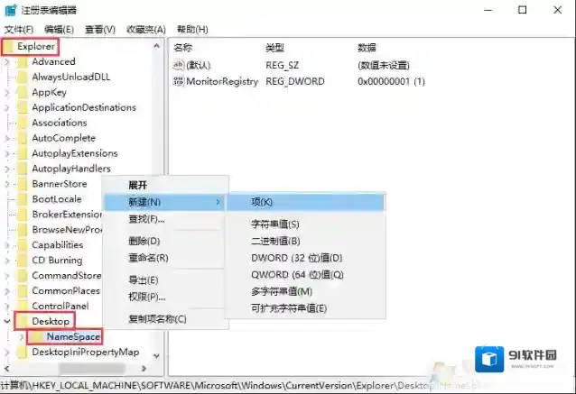 4、右键点击“NameSpace”,选择新建一个名为“{645FF040-5081-101B-9F08-00AA002F954E}”的项。