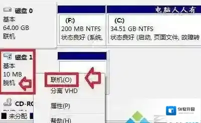 3、右键点击有问题的磁盘(脱机)→弹出菜单中点击脱机;
