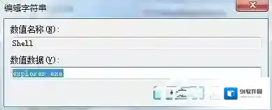 5、在界面的右边列表中找到“shell“项,用鼠标点击打开,修改对话框”数字数据“为”explorer.exe“点击确定,关闭注册表,完成设置。如下图所示: