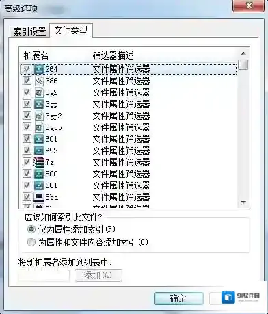 8、再点击文件类型,去除不需要搜索的扩展名确定,比如:sys(扩展名)=系统文件;dll(扩展名)=动态链文件;exe(扩展名)=可执行文件;inf(扩展名)=安装文件。
