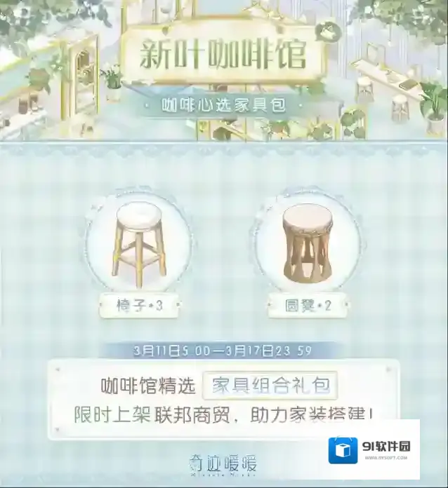 活动期间,联邦商贸将推出新叶咖啡馆限定家具组合礼包,助力家装搭建: