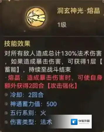 然后法宝推荐带具有 洞玄神光 熔晶 技能的法宝(火熔晶炼制),其暴击效果叠加增伤可以打出更高的伤害
