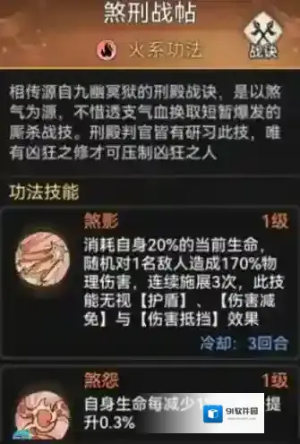 功法装备可以选择 煞刑战帖 (仙缘寻访获得),耗血增伤配合吸血续航,功法无视防御可以打出不俗伤害