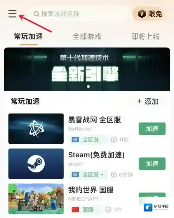 1、第一步,在电脑上下载好雷神加速器并启动,在主界面点击右上角的三条横线标志,进入到菜单页面。