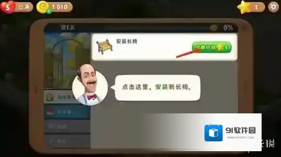 2、出现游戏任务了,我们需要在公园安装长椅,继续点击屏幕。