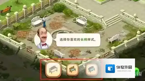 4、如图,提供了三种长椅可以选择,点击相应的长椅可以进行预览,选择好后点击右下角打勾图标即可确认,得到了管家的好评。