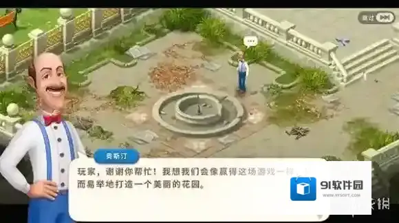 1、打开梦幻花园手游,进入游戏剧情界面,点击右上角可跳过。