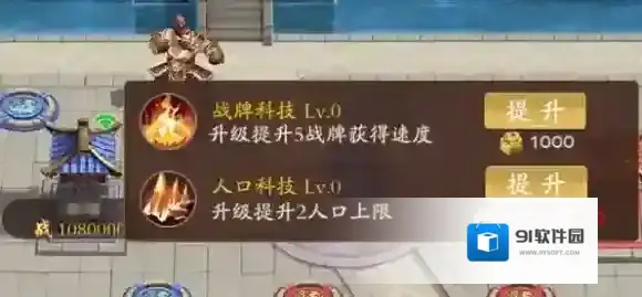 5、点击带有自身名称的科技建筑可以升级塔防科技,人口科技可提升上阵人口上限,武魂科技可提升战牌的获取速度。