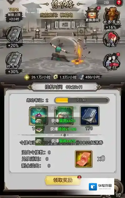 在练功房里,玩家可以悠闲离线挂机,获得丰厚的经验、银币、武学卡和BOSS扫荡券等奖励,练功时间越长,奖励越丰富,最长可达8小时。