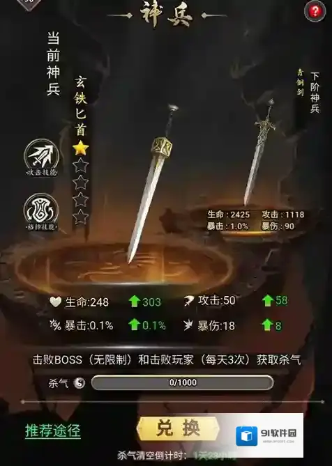 消耗杀气可升级神兵,随着神兵等级的不断提升,神兵外观将焕然一新,同时伴随着属性的飙升。每次的进化都是一次剑术的巅峰演绎,将助你在战场上傲立不败!