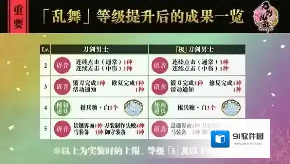 「乱舞」等级与现有的「刀剑」等级不同,是能够让刀剑男士通过「习合」来提升的另外一种等级系统。