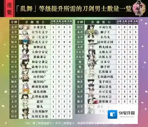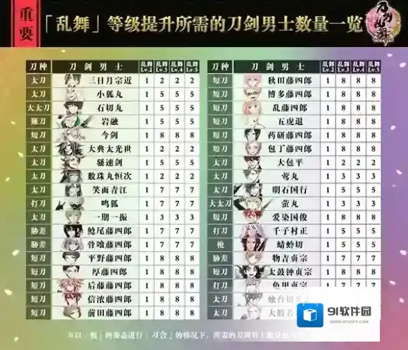 「乱舞」等级提升所需的刀剑男士数量