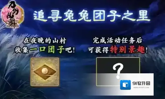 审神者在出阵时偶尔会发现兔子的踪迹,通过击败敌人、追寻兔兔或击破BOSS,有几率获得活动道具一口团子。对刀剑男士使用一口团子,能够大幅恢复一位刀剑男士的疲劳度,并听到全新的特别语音;完成活动任务对刀剑男士使用50个一口团子后,可以获得中秋特别景趣。