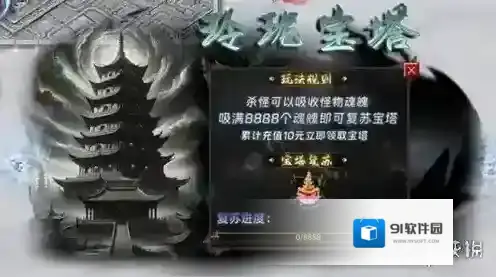 杀怪可以吸收怪物魂魄吸满8888个魂魄即可复苏宝塔,累计充值10元立即领取宝塔。