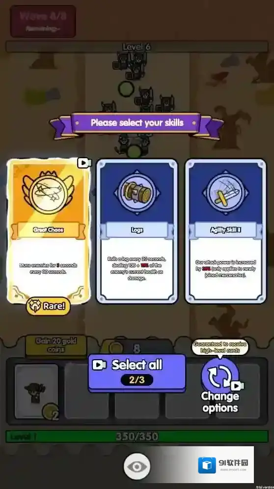 3、召唤不同的小兵需要的金币数量是不一样的,当击败敌人后会获得经验,提升等级后可以选择一个技能来强化小兵。