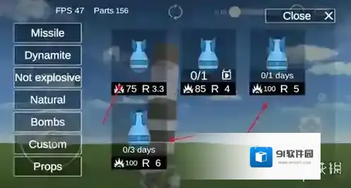 4、打开道具选择界面,挑选适合的爆破类道具,利用其破坏效果来提高建筑的损毁效率,从而积累更多积分。